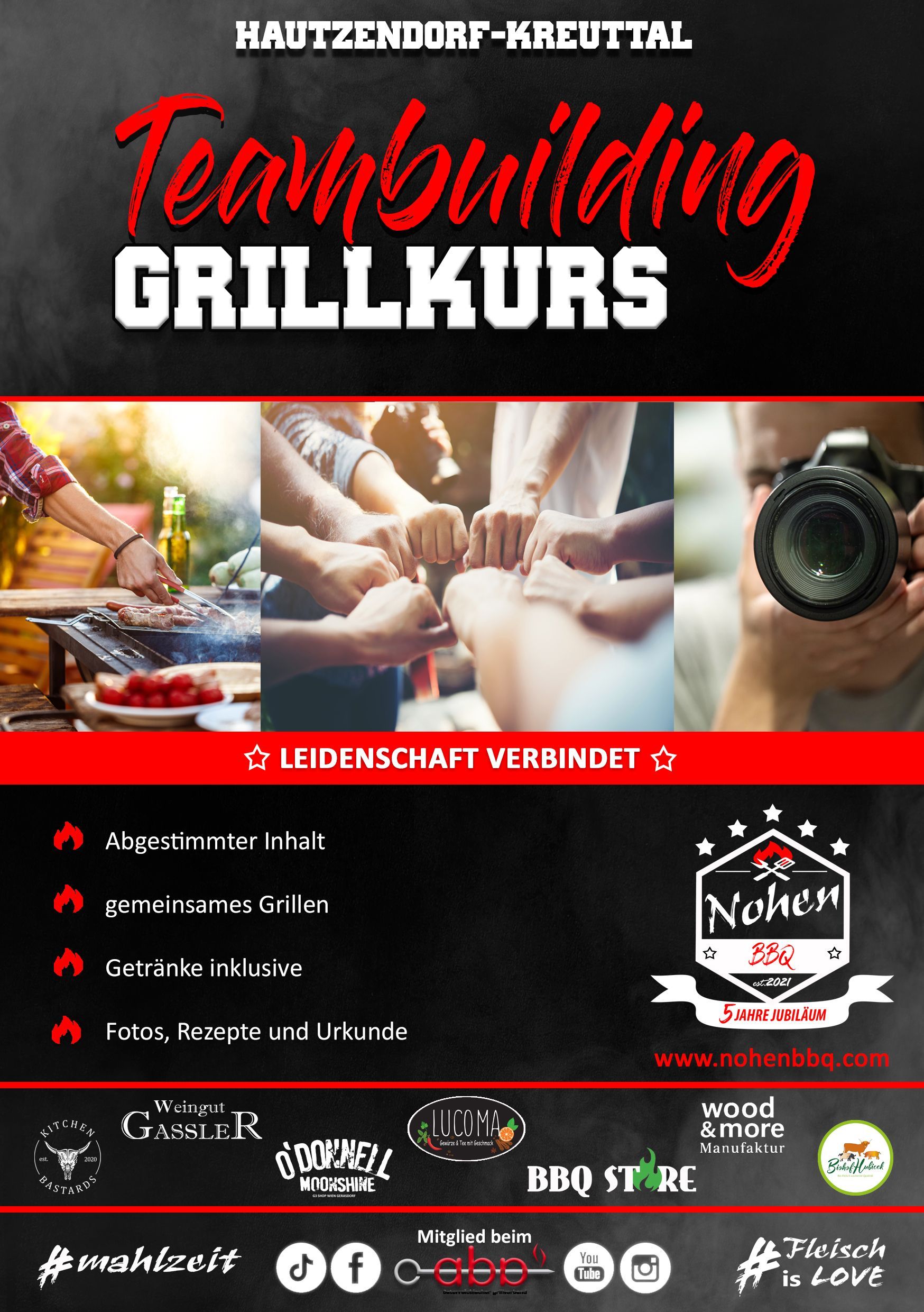 Bei diesem Grillkurs dreht es sich alles um das Teambuilding und vor allem jede Menge Spaß. Die Kurse dauern im Durchschnitt zwischen 3-5 Stunden. Ihr könnt ein Thema nehmen, verschiedenen kombinieren oder euch einfach überraschen lassen. Das Ganze wird dokumentiert um immer wieder an diesem Moment zurückblicken zu können. Ihr lernt den Umgang mit verschiedenen Hitzequellen und Grillgeräte. Dabei werden die wichtigsten Keyfacts erklärt.